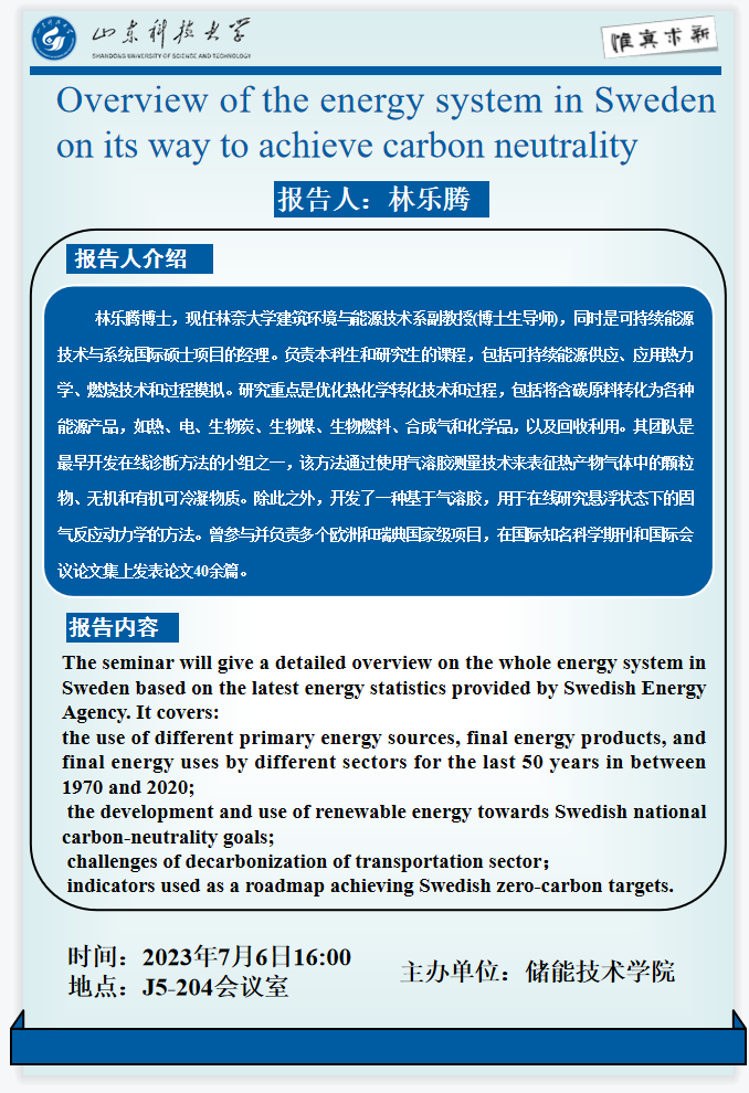 学术报告:Overview of the energy system in Sweden on its way to achieve carbon neutrality