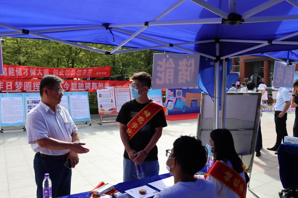 公司领导在迎新点跟工作人员交流